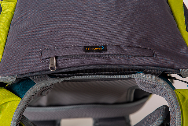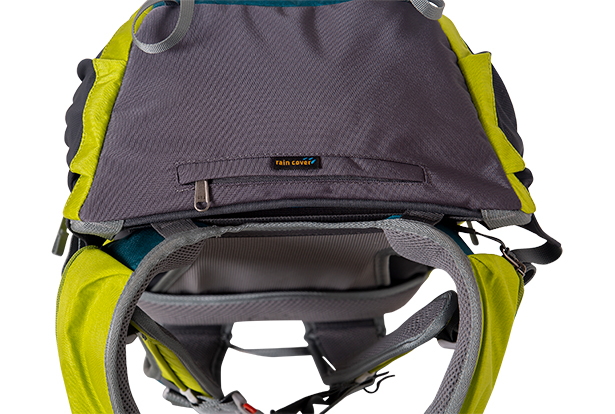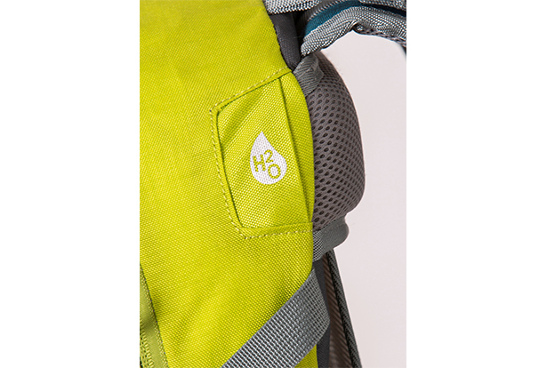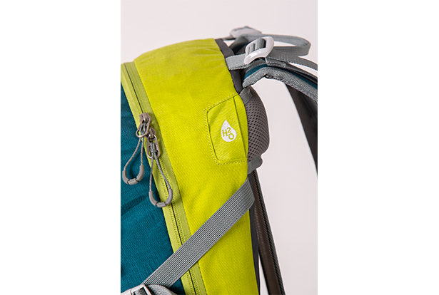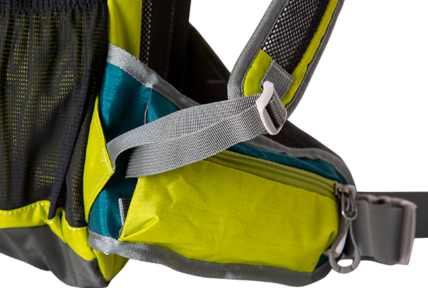 Tensor de pecho regulable en altura, cintas de compresión lateral, bolsillos laterales con rejillas, lleva bastones, acceso hydrobag.