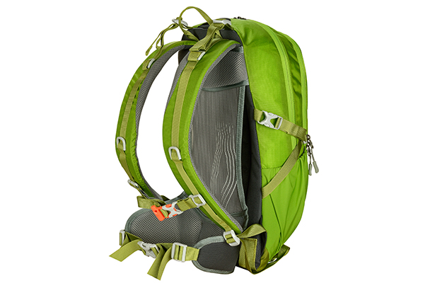 Tensor de pecho regulable en altura, cintas de compresión lateral, bolsillos laterales, lleva bastones, acceso hydrobag.