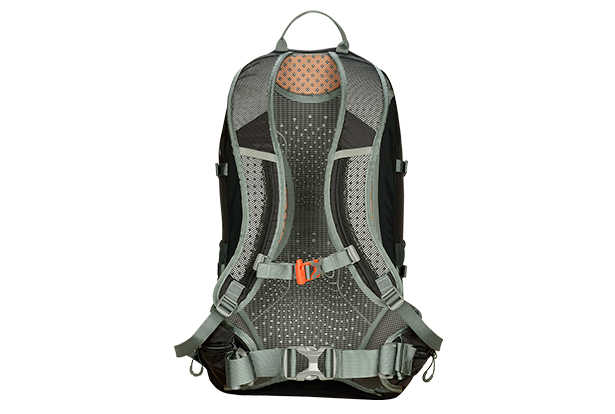 Tensor de pecho regulable en altura, cintas de compresión lateral, bolsillos laterales con rejillas, lleva bastones, acceso hydrobag.