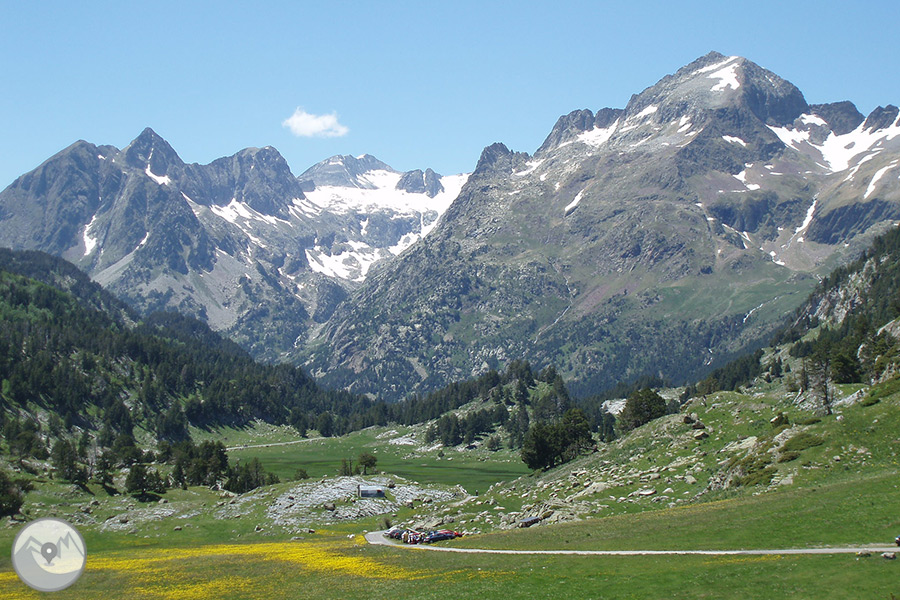 4:15h de la mañana en Benasque (en la entrada del pueblo frente a la tienda Barrabés, que está situada entrando a mano derecha). Desde este punto nos desplazaremos en coches particulares hasta el Hospital de Benasque (unos 11 km) donde, si hacemos la ruta entre el 21/06 y el 14/09, estacionaremos los vehículos y tomaremos a las 5:00h el autobús público que nos llevará hasta la Besurta (unos 30 minutos). Si hacemos la ruta en otras fechas, el acceso a la Besurta está abierto y podremos subir hasta este punto en coches particulares.