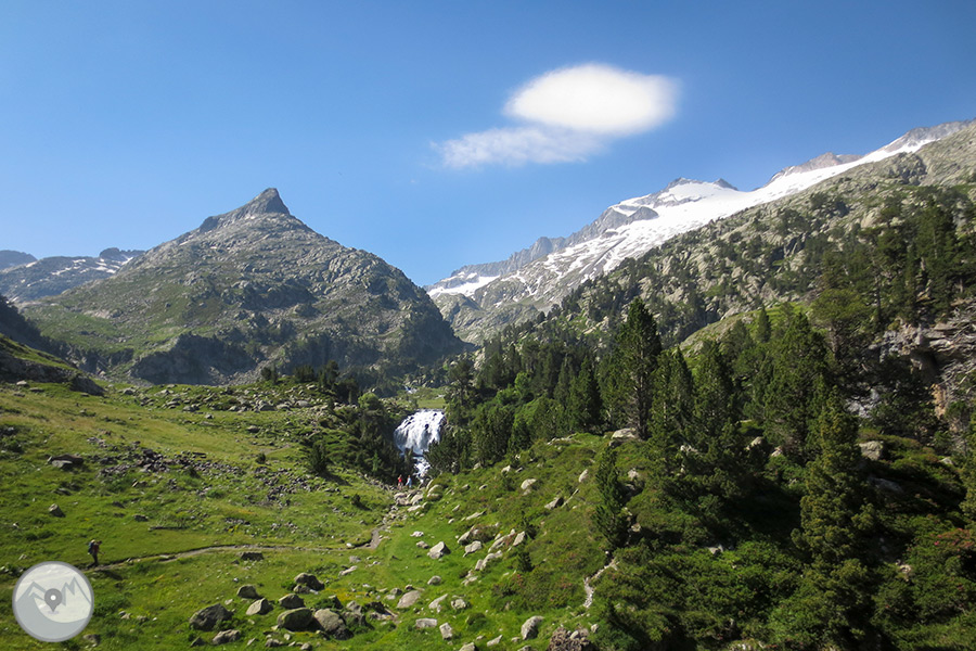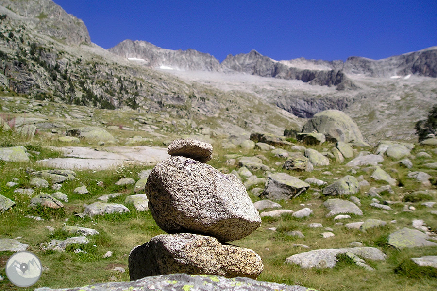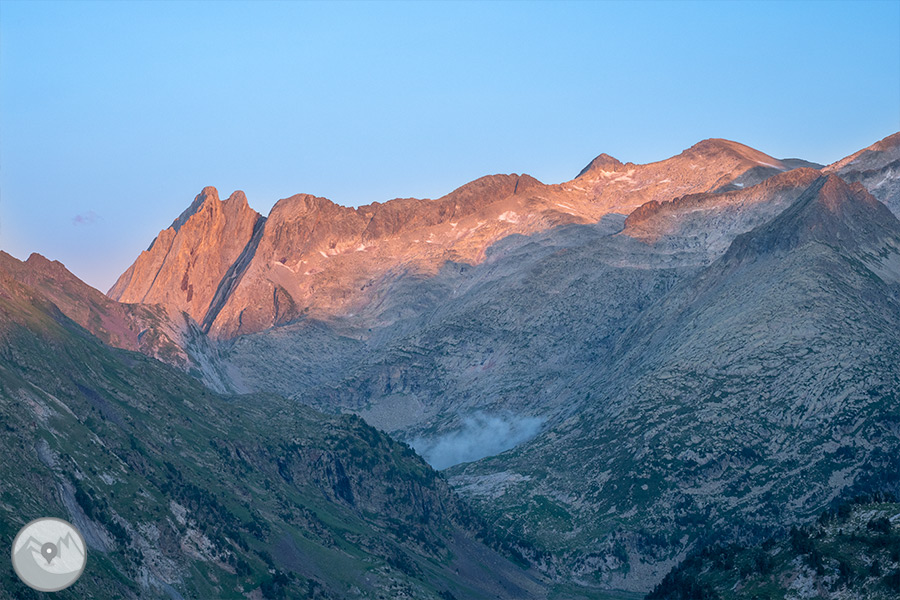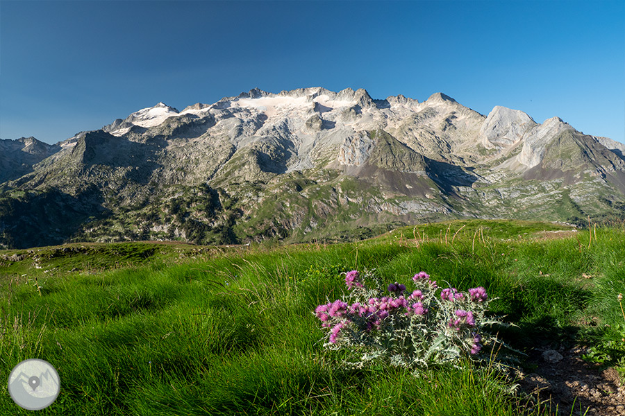 Empezamos la travesía en el Plan de Senarta, remontamos el río Ésera pasando por los conocidos Llanos del Hospital -punto de paso histórico por su proximidad con la frontera- y llegamos a la Besurta, donde nos desviamos hasta el refugio de la Renclusa, donde hacemos la primera noche. El segundo día bajamos hasta los tranquilos Plans de Aigüalluts desde donde ascendemos por el bonito valle de Barrancs hasta el punto más alto de la travesía, el impresionante y panorámico collado de Salenques, a 2.809m de altitud. Continuamos hasta el moderno refugio de Llauset, que, situado a 2.425m, es el refugio más alto del Pirineo aragonés. El último día hacemos ruta enlazando varios pequeños ibones de alta montaña de gran belleza, como los de Coma Arnau, de Vallibierna y de Llosars, y terminamos el itinerario a pie en el puente de Coronas. Punto estratégico donde tomamos el autobús lanzadera del Parque Natural que nos retorna por pista hasta el Plan de Senarta, cerrando así la vuelta al macizo.