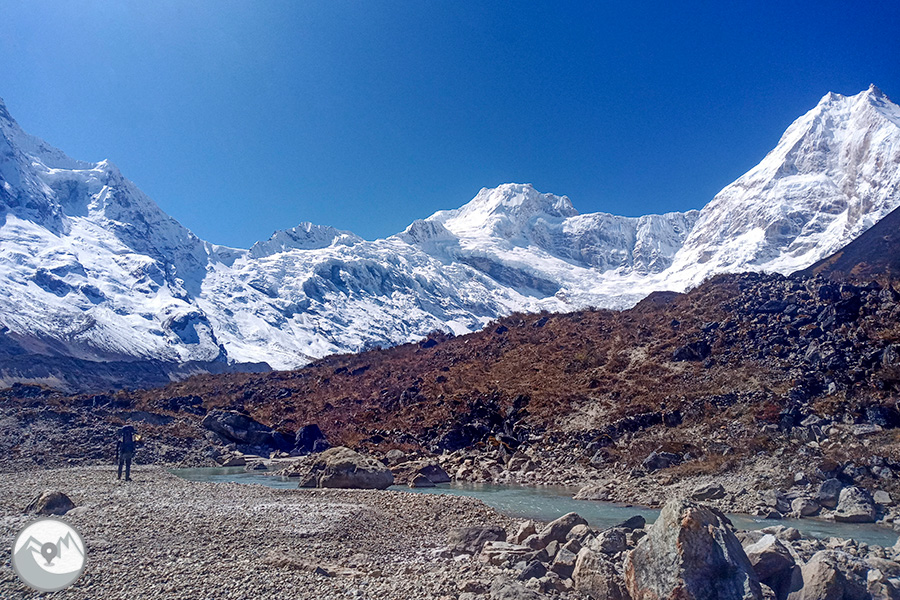 Empezamos la jornada bajo las estrellas para poder llegar a buena hora al collado. El camino asciende progresivamente por la morrena del glaciar. Entre lagos, glaciares, caos de rocas y paredes verticales llegamos al collado Larke La, a 5.180 m de altitud. Corta parada para disfrutar del ambiente y comer algo antes de empezar el largo descenso. Unos 1400 metros de bajada, la primera parte empinada y resbaladiza, nos llevará a Bhimtang, una llanura con vistas excepcionales de la cara oeste del macizo del Manaslu. Aquí dispondremos de todo tipo de comodidades después de la austera noche anterior.