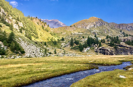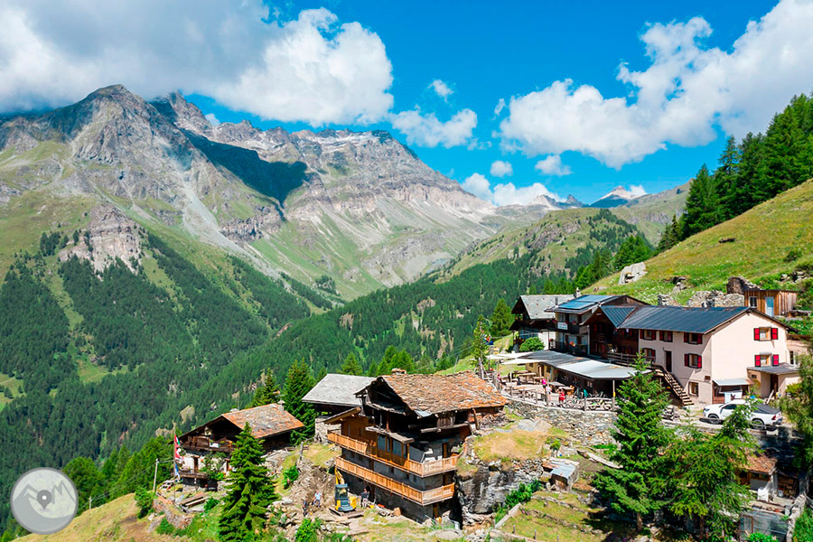 Empezamos esta etapa descendiendo suavemente hasta el pueblo de Alagna Valsesia. En este punto empezamos el tramo de ascenso continuado más largo de la travesía. Esta subida, que muchos alpinistas que quieren ascender a los 4.000m del entorno se ahorran cogiendo teleféricos, es un auténtico reto que queda recompensado con creces al llegar al collado de Olen, territorio de marmotas y cabras salvajes, donde los prados verdes y la roca esculpida enmarcan un paisaje lleno de montañas hasta el horizonte. Ésta es nuestra entrada al Valle de Aosta y, tras el esfuerzo del ascenso, una rápida y agradable bajada nos lleva hasta el Albergo del Ponte, situado frente al precioso lago de Gabiet.