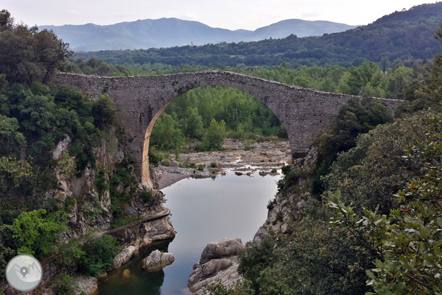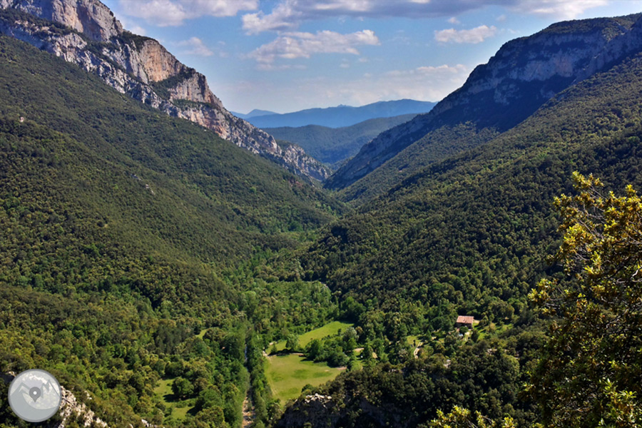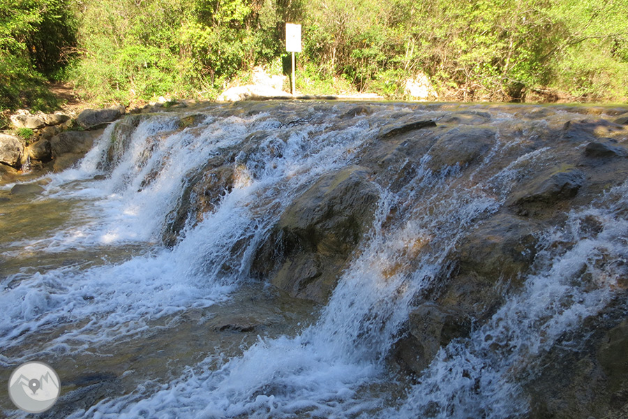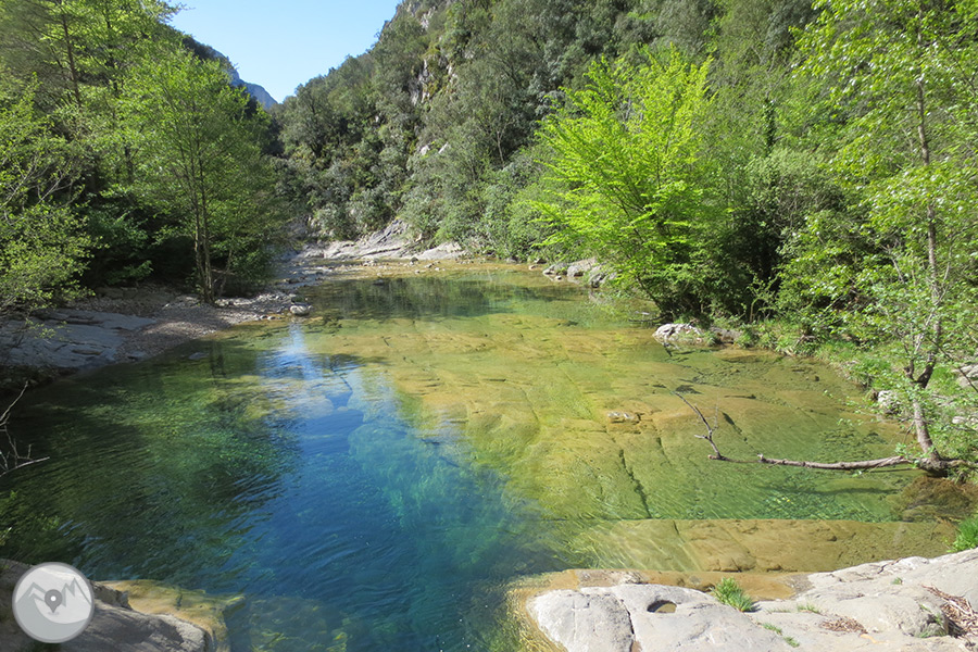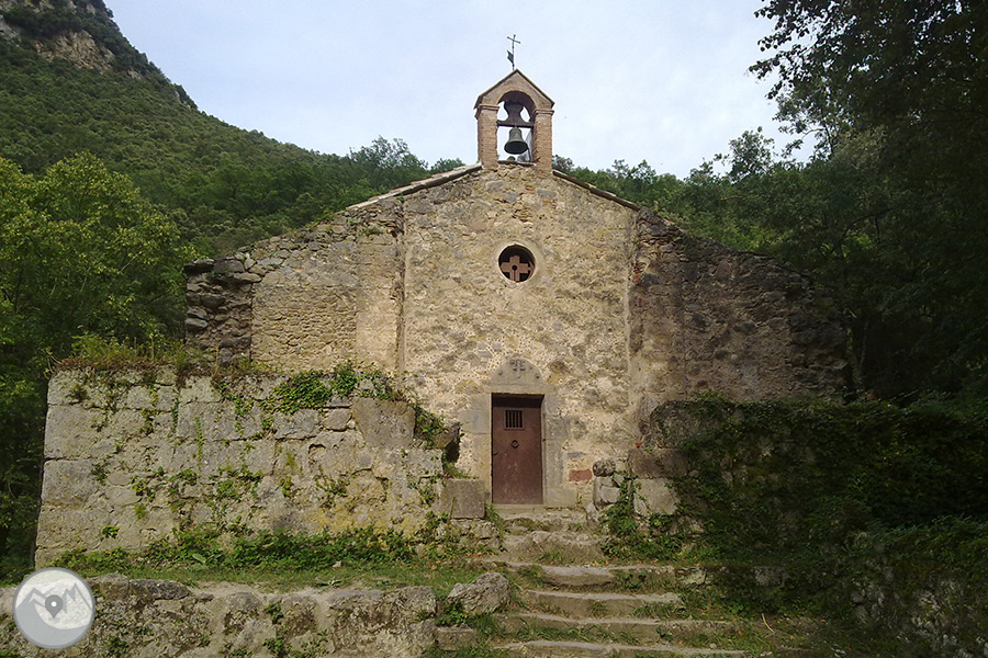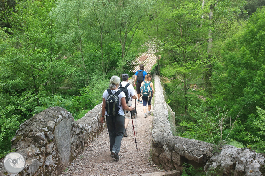 Empezaremos la ruta en el pueblo de Sadernes. Desde este punto nos adentramos en el valle de Sant Aniol avanzando por el lado del río. Pronto nos veremos rodeados por los grandes acantilados calizos, la frondosidad de los bosques de encinas y el gran colorido de la ribera: fresnos, olmos, avellanos, castaños,... De camino al refugio y ermita de Sant Aniol d'Aguja, tomaremos conciencia del escenario sublime que nos rodea, un auténtico santuario natural que hace falta conocer, querer y proteger. El recorrido se animará con un conjunto de puentes antiguos y nuevos, y descubriremos cuevas, balmas y pozas hasta llegar finalmente a la ermita de Sant Aniol. El regreso a Sadernes lo haremos por el camino del Salt de la Núvia, un sendero en la cornisa de la montaña que nos ofrecerá magníficas vistas de todo el valle de Sant Aniol.